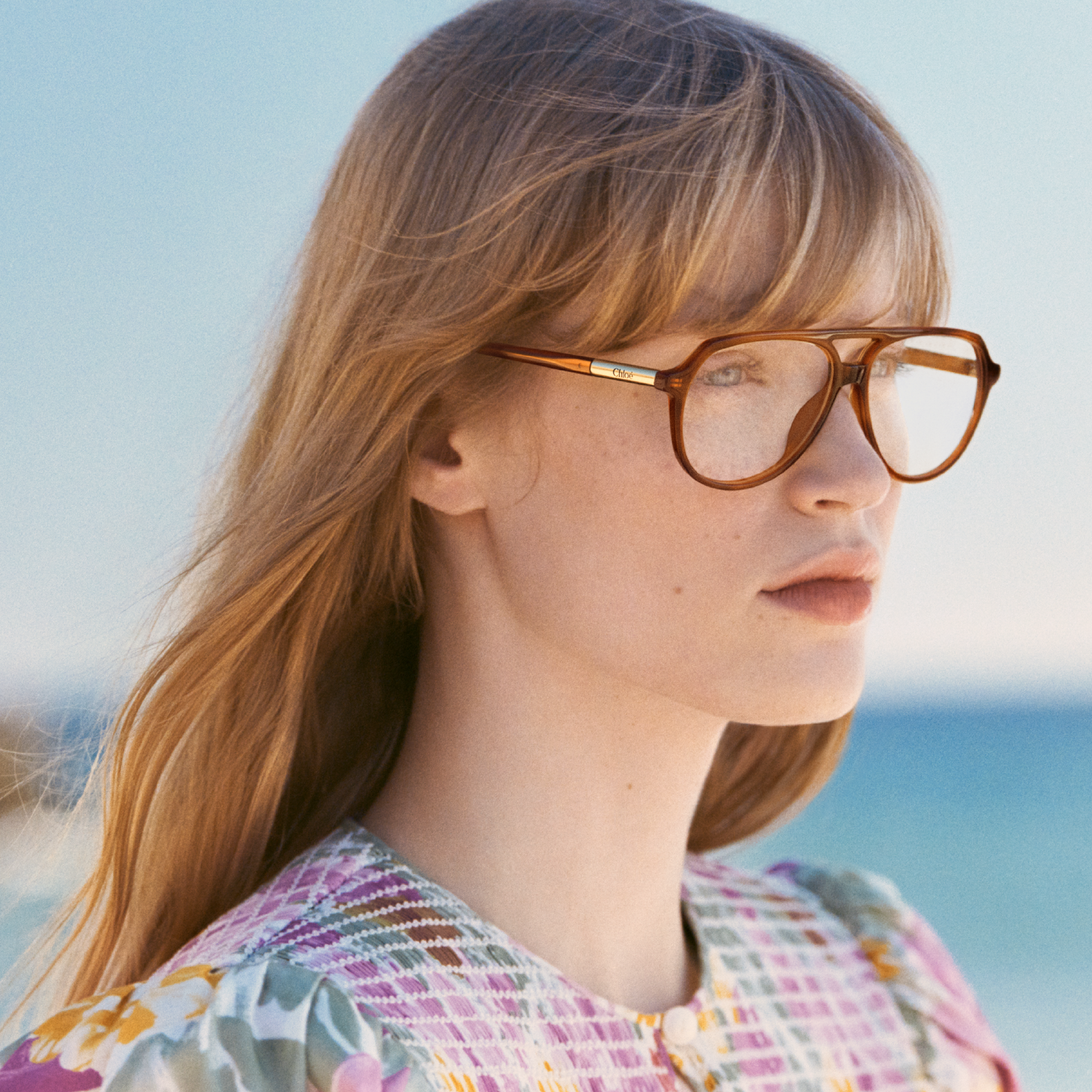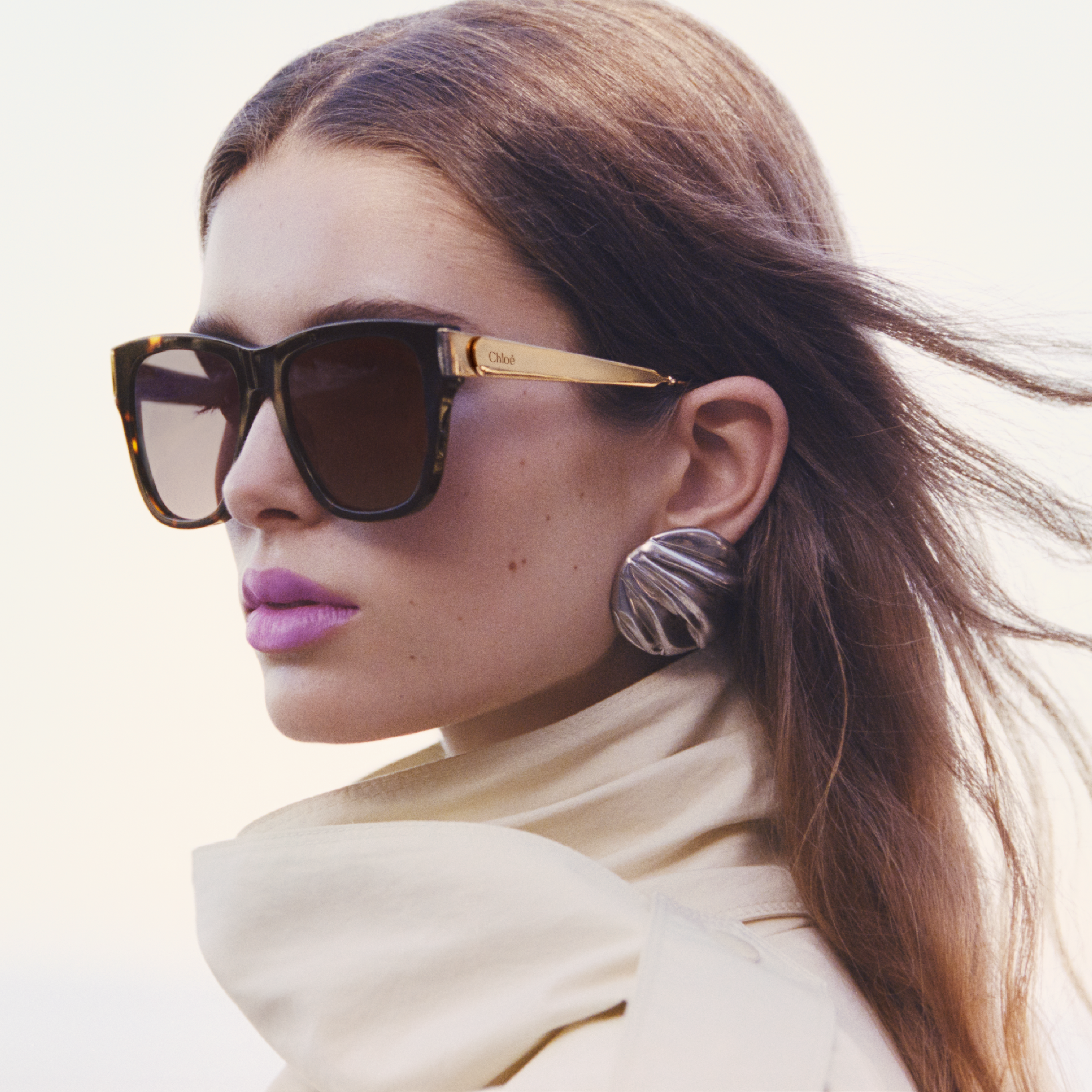 Aly kehrt in dieser Saison als markante Oversize-Fassung zurück, mit einer Acetat-Front, einer schlanken Top Bar aus Metall und filigranen Bügeln, ein spannungsvoller Kontrast, ganz im Sinne der Chloé-DNA.